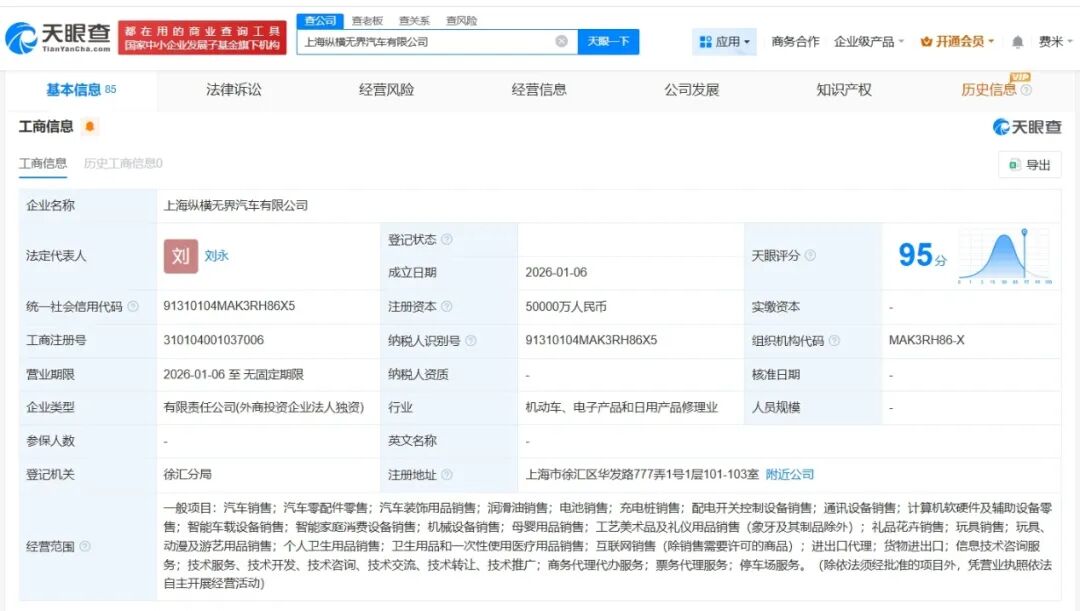 天眼查工商信息显示,1月6日,上海纵横无界汽车有限公司成立,法定代表人为刘永,注册资本5亿人民币,经营范围包括汽车销售、汽车零配件零售、汽车装饰用品销售、润滑油销售等。股东信息显示,该公司由奇瑞汽车股份有限公司全资持股。