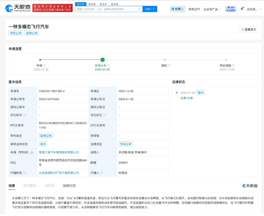 天眼查知识产权信息显示,近日,安徽江淮汽车集团股份有限公司申请的“一种多模态飞行汽车”专利公布。