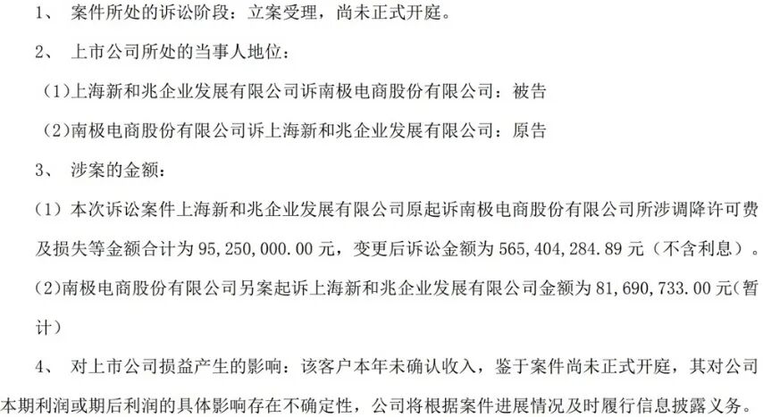 而南极电商于2025年4月另案起诉上海新和兆及上海和兆品牌管理有限公司,请求判令其支付基本授权许可使用费、商标使用费、因违约行为造成公司预期利益损失等多项费用。截至2025年5月31日,前述诉请总金额暂计8169.07万元。