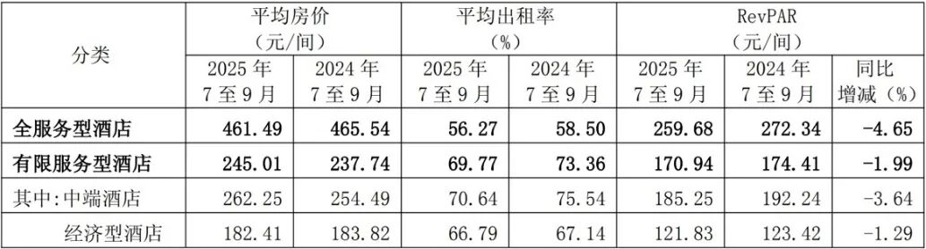 2025年7至9月,锦江酒店中国境内有限服务型酒店的平均房价小幅回升至245.01元/间,但平均出租率同比下滑3.59%,RevPAR也较上年同期减少1.99%至170.94元/间。期间,公司全服务型酒店的RevPAR同样延续下行,降幅为4.65%。
