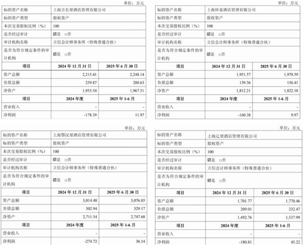 从财务数据来看,锦江酒店此次拟转让的四家酒店管理公司表现欠佳。2024年,上海吉长堃、上海怀臬、上海鄂汉堃和上海辽堃均处于亏损状态,净利润分别为-178.39万元、-160.38万元、-274.72万元和-180.81万元,合计净亏超700万元。至2025年上半年,这四家公司虽扭亏,但净利润规模不足百万,仅徘徊在9.97万元至45.22万元之间。