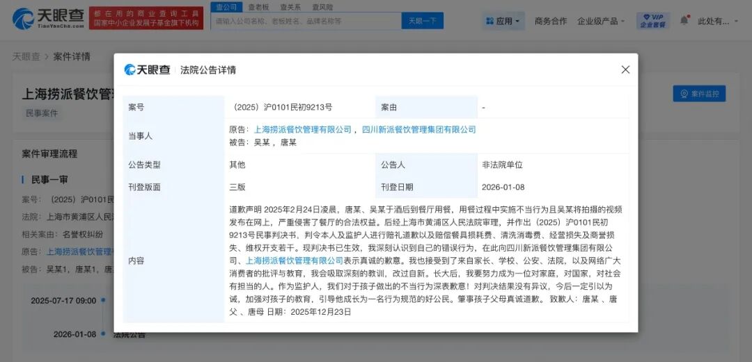 天眼查法律诉讼信息显示,法院刊登海底捞小便事件及其父母的道歉声明,2025年2月24日凌晨,唐某、吴某于酒后到餐厅用餐,用餐过程中实施不当行为且吴某将拍摄的视频发布在网上,严重侵害了餐厅的合法权益。声明称其深刻认识到自己的错误行为,向四川新派餐饮管理集团有限公司、上海捞派餐饮管理有限公司表示真诚的歉意。接受到了来自家长、学校、公安、法院,以及网络广大消费者的批评与教育,会吸取深刻的教训,改过自新。作为监护人,其表示对于孩子做出的不当行为深表歉意。