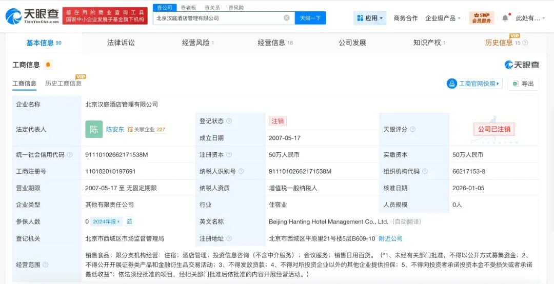 天眼查App显示,近日,北京汉庭酒店管理有限公司经营状态由存续变更为注销。