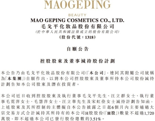 近日,毛戈平化妆品股份有限公司(下称毛戈平公司,1318.HK)的一则减持消息引发市场关注。公司控股股东及执行董事毛戈平、汪立群,执行董事毛霓萍、毛慧萍、汪立华及宋虹佺拟合计减持不超过1720万股公司H股股份,即不超过公司已发行股份总数的3.51%。按2026年1月8日收盘价(86.65港元/股)计算,此次减持拟套现金额或达14.90亿港元。
