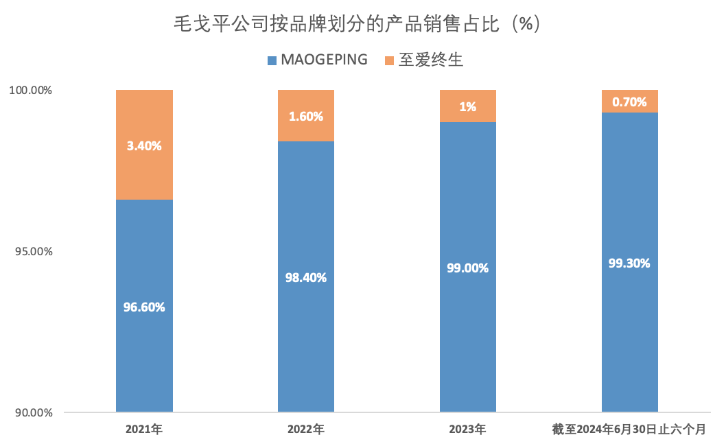 从收入结构看,近年来,毛戈平公司的产品销售收入主要来自MAOGEPING。据公司招股书披露,2021年至2023年以及截至2024年6月30日止六个月,MAOGEPING的产品销售占公司产品销售总收入比重均超过九成,分别为96.6%、98.4%、99.0%和99.3%。在2025年半年报中,公司仍在强调,MAOGEPING品牌贡献了2025年上半年主要的产品销售收入。