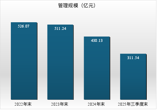 浙商基金于2010年9月28日获批设立,同年10月正式开业运营。现有股东方包括民生人寿保险股份有限公司、浙商证券股份有限公司和养生堂有限公司,持股比例分别为50%、25%、25%。Wind数据显示,截至2025年三季度末,浙商基金公募管理规模为311.54亿元,在行业中居于第102位,较2024年四季度末减少了118.59亿元。从更长的时间来看,浙商基金公募管理规模已连续几年下降——2022年末至2024年末的规模依次为526.07亿元、511.24亿元、430.13亿元。