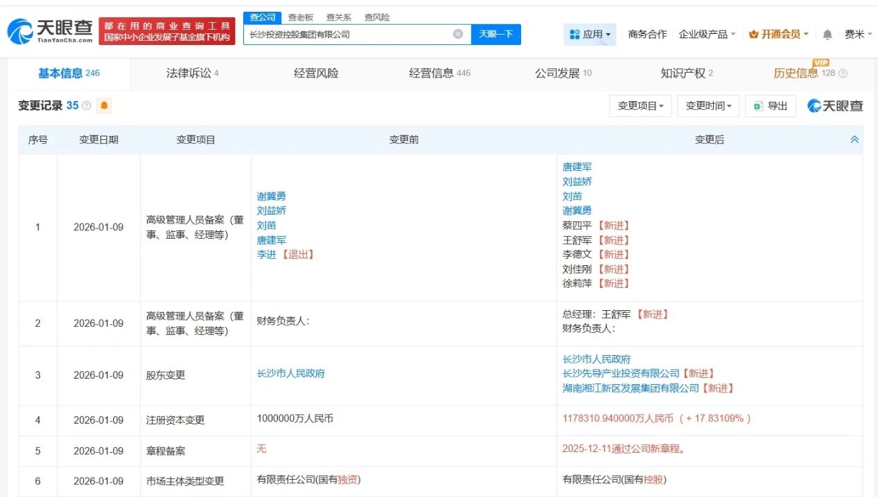 天眼查工商信息显示,近日,长沙投资控股集团有限公司发生工商变更,新增长沙先导产业投资有限公司、湖南湘江新区发展集团有限公司为股东,注册资本由100亿人民币增至约117.8亿人民币,增幅约18%,同时,多位主要人员发生变更。