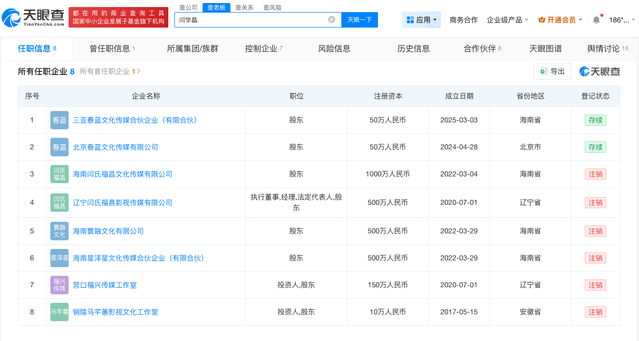 天眼查App显示,闫学晶名下共关联8家公司,其中,三亚春蓝文化传媒合伙企业(有限合伙)、北京春蓝文化传媒有限公司为存续状态,其余6家企业已注销,上述存续企业均为闫学晶与儿子林傲霏的合作企业。林傲霏名下共关联3家存续企业。