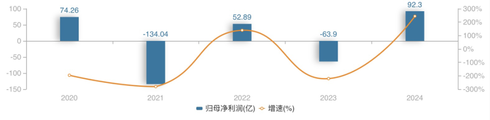 Wind数据显示,2020年至2024年,公司归母净利润分别为74.26亿元、-134.04亿元、52.89亿元、-63.90亿元和92.30亿元,对应各年的同比增速分别为-46.83%、-281%、139%、-221%和244%。