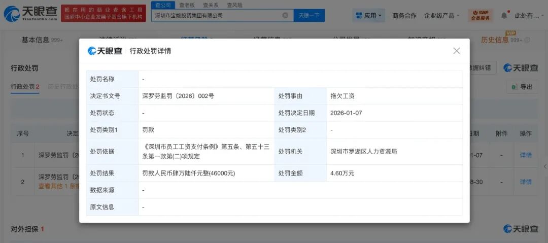 深圳市宝能投资集团有限公司因拖欠工资,被深圳市罗湖区人力资源局罚款