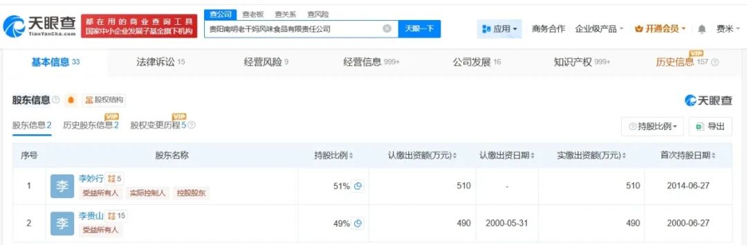 对外投资信息显示,该公司对外投资贵阳南明老干妈风味食品销售有限公司。