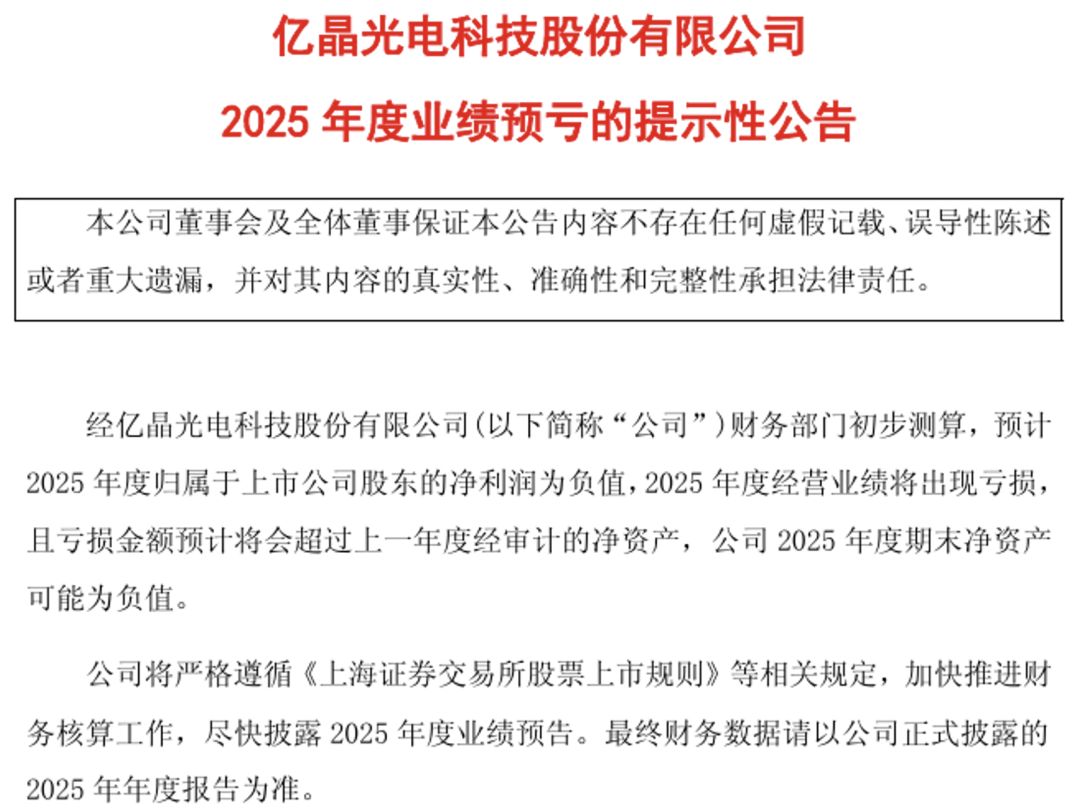 亿晶光电(600537.SH)新近发布的业绩预亏公告显示,经公司财务部门初步测算,预计2025年度归属于上市公司股东的净利润为负值,同期经营业绩将出现亏损,且亏损金额预计超过2024年末经审计净资产,公司2025年末净资产可能为负值。