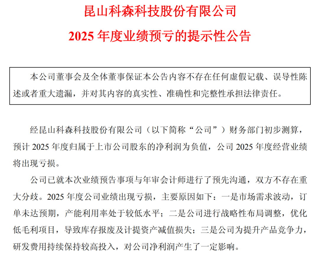 昆山科森科技股份有限公司(下称科森科技,603626.SH)近日披露业绩预告。公告显示,经财务部门初步测算,公司预计2025年归母净利润仍为负值,全年将延续亏损态势。