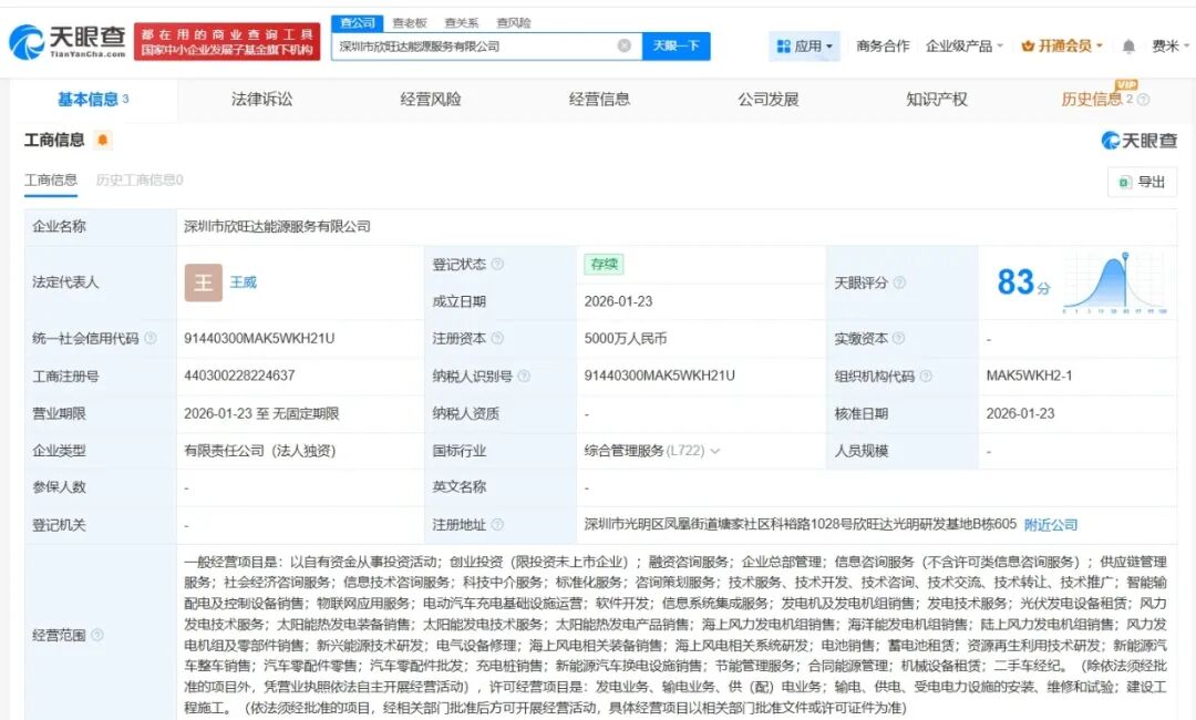 天眼查App显示,1月23日,深圳市欣旺达能源服务有限公司成立,法定代表人为王威,注册资本5000万人民币,经营范围包括以自有资金从事投资活动、创业投资、融资咨询服务等,由欣旺达(300207)全资持股。