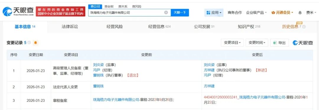 天眼查工商信息显示,近日,珠海格力电子元器件有限公司发生工商变更,董明珠卸任法定代表人、执行董事,方祥建接任法定代表人并担任执行公司事务的董事。