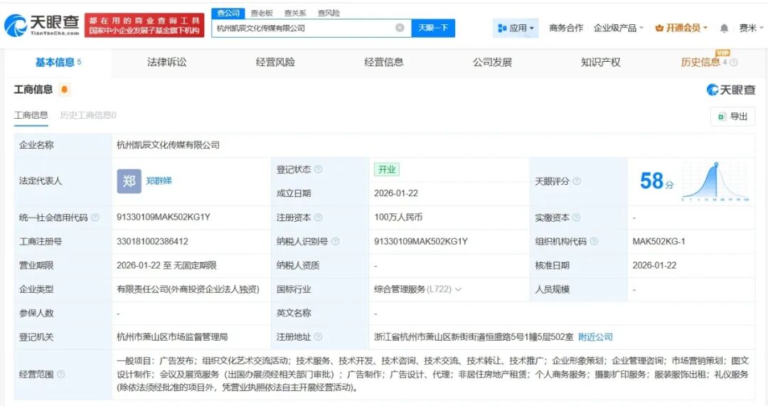 杭州凯辰文化传媒有限公司成立,法定代表人为郑群娣,董事为宗馥莉