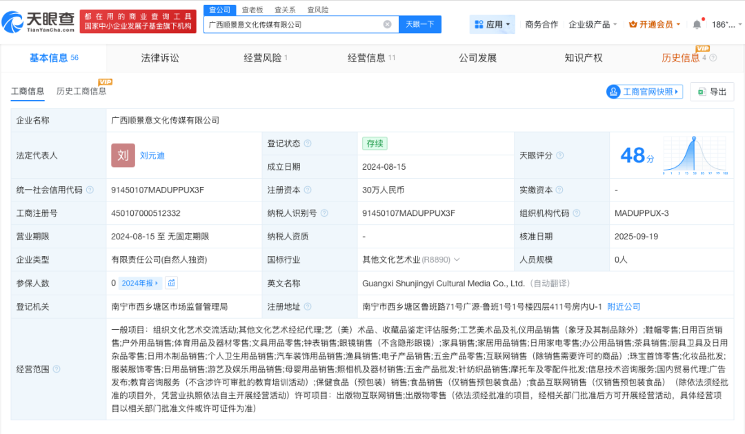 天眼查App显示,广西顺景意文化传媒有限公司成立于2024年8月,法定代表人为刘元迪,注册资本30万人民币,经营范围包括组织文化艺术交流活动、其他文化艺术经纪代理、互联网销售等。风险信息显示,2025年10月,该公司因通过登记的住所或者经营场所无法联系,被南宁市西乡塘区市场监督管理局列入经营异常名录。