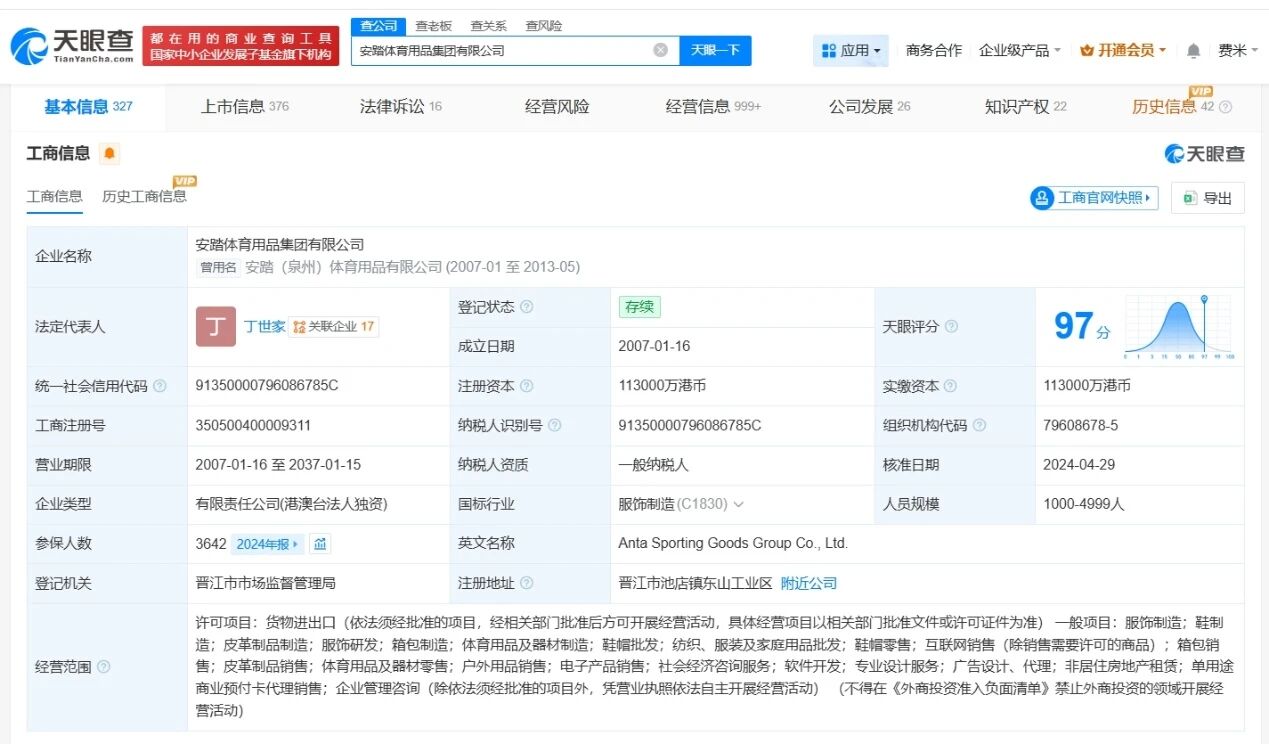 天眼查工商信息显示,安踏体育用品集团有限公司成立于2007年1月,法定代表人为丁世家,注册资本11.3亿港元,经营范围包括服饰制造、鞋制造、皮革制品制造等。股东信息显示,该公司由安踏投资有限公司全资持股。对外投资信息显示,该公司对外投资38家企业,其中32家处于存续状态,包括福建安踏物流信息科技有限公司、厦门安踏有限公司等。