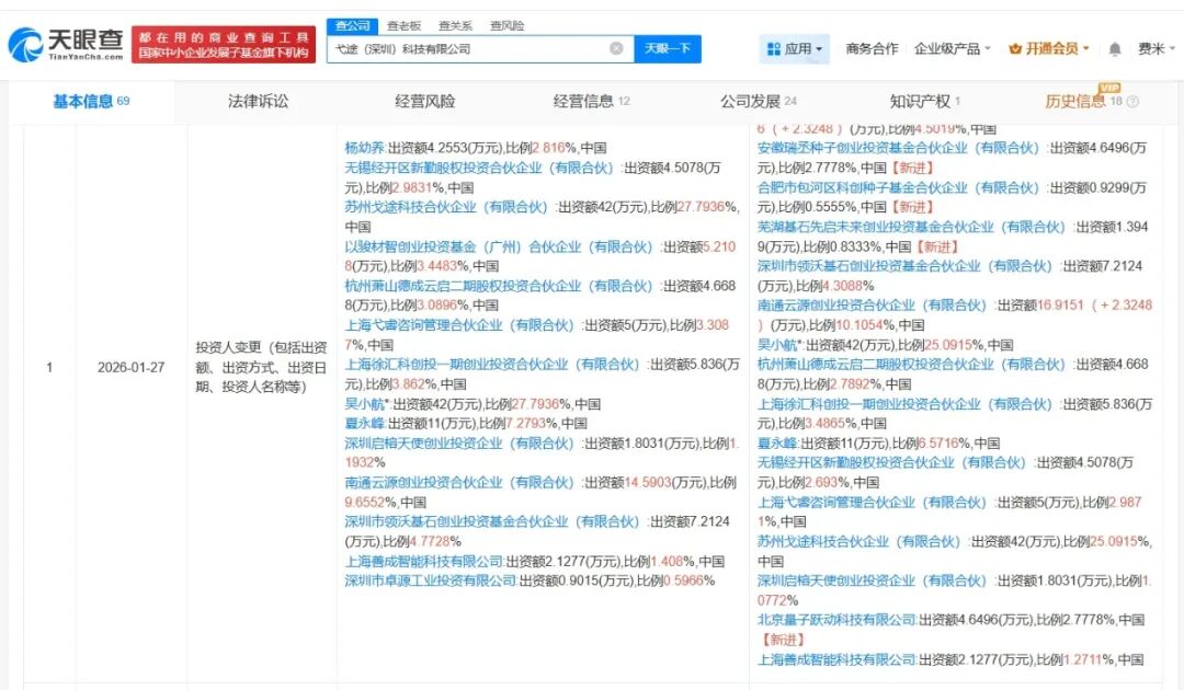 天眼查工商信息显示,近日,弋途(深圳)科技有限公司发生工商变更,新增字节跳动旗下北京量子跃动科技有限公司、芜湖基石先启未来创业投资基金合伙企业(有限合伙)等为股东,同时,注册资本由约151万人民币增至约167万人民币。