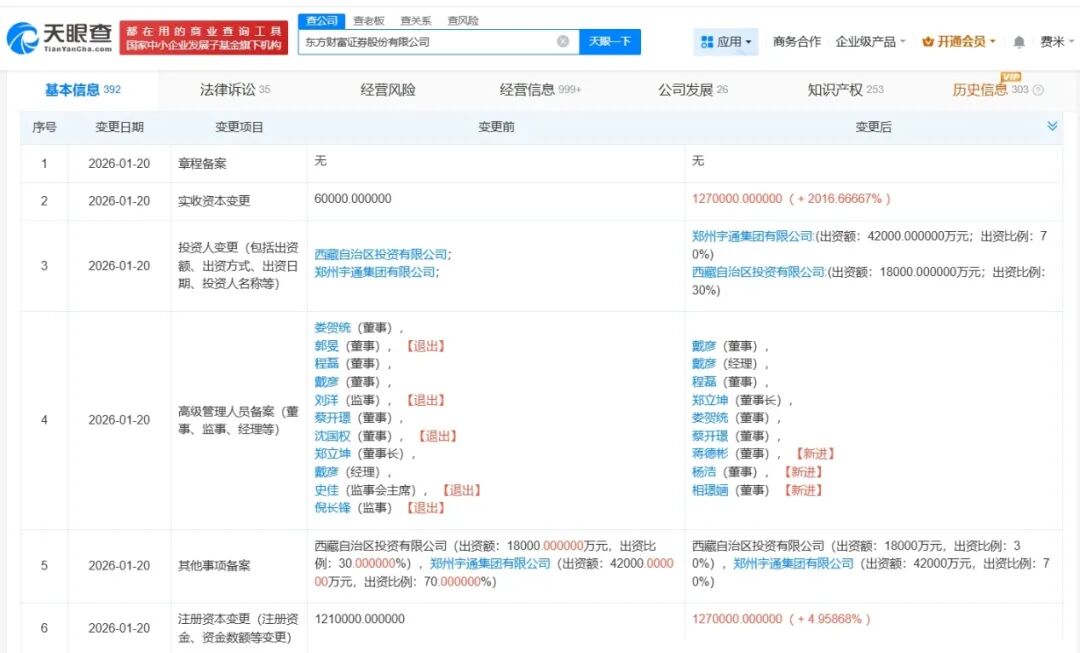 天眼查App显示,近日,东方财富证券股份有限公司发生工商变更,注册资本由121亿人民币增至127亿人民币,增幅约5%,同时,多位高管发生变更。