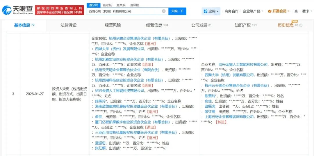西湖心辰(杭州)科技有限公司成立于2021年7月,法定代表人为陈燕玲,注册资本约244万人民币,经营范围包括人工智能应用软件开发、健康咨询服务、第二类增值电信业务等。股东信息显示,该公司现由蓝振忠、绍兴金猫人工智能科技有限公司及上述新增股东等共同持股。官网显示,该公司致力于AI大模型技术的探索与研究,专注于人工智能服务的创新与应用。