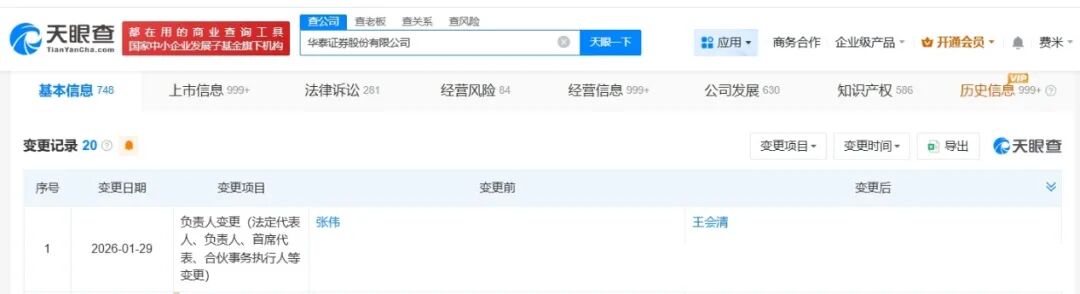 华泰证券(601688)发生工商变更,张伟卸任法定代表人、董事长,由王会清接任