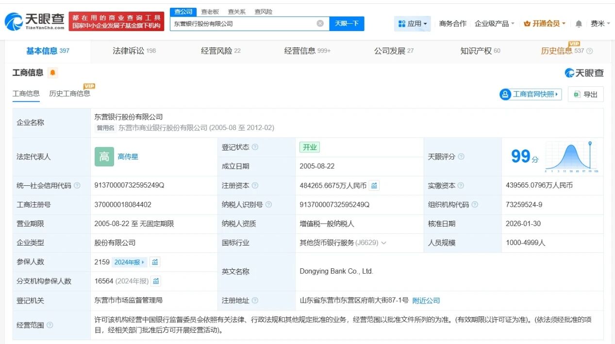 根据该公司官网信息显示,东营银行股份有限公司于2005年9月在原城市信用社基础上组建成立,原名东营市商业银行,2012年经中国银监会批准,更名为东营银行。