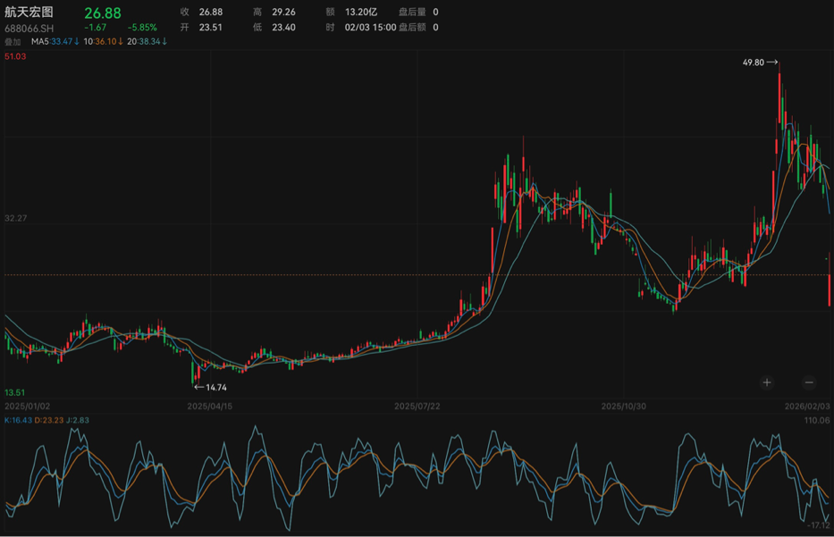 二级市场方面,在“商业航天”概念持续发酵的背景下,航天宏图曾在1月12日盘中触及49.8元/股(不复权,下同)的年内高点。或受上述利空消息影响,2月3日航天宏图继续走跌,早盘最大跌幅超17%,截至收盘,该股报26.88元/股,较此前高点已回落46%,最新市值为70亿元。