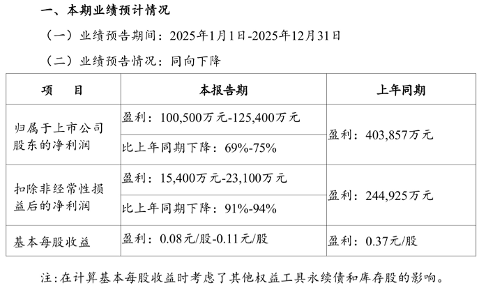 日前,招商蛇口发布业绩预告显示,公司2025年度经营业绩预计将出现同向下降。其中,归母净利润预计在10.05亿元至12.54亿元之间,同比下降69%至75%;扣除非经常性损益后的净利润预计在1.54亿元至2.31亿元之间,同比下降91%至94%。