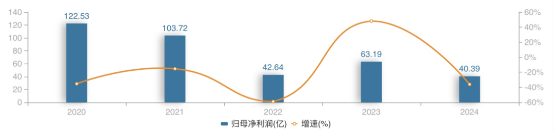 2020年至2024年招商蛇口归母净利润及同比情况(亿元、%)