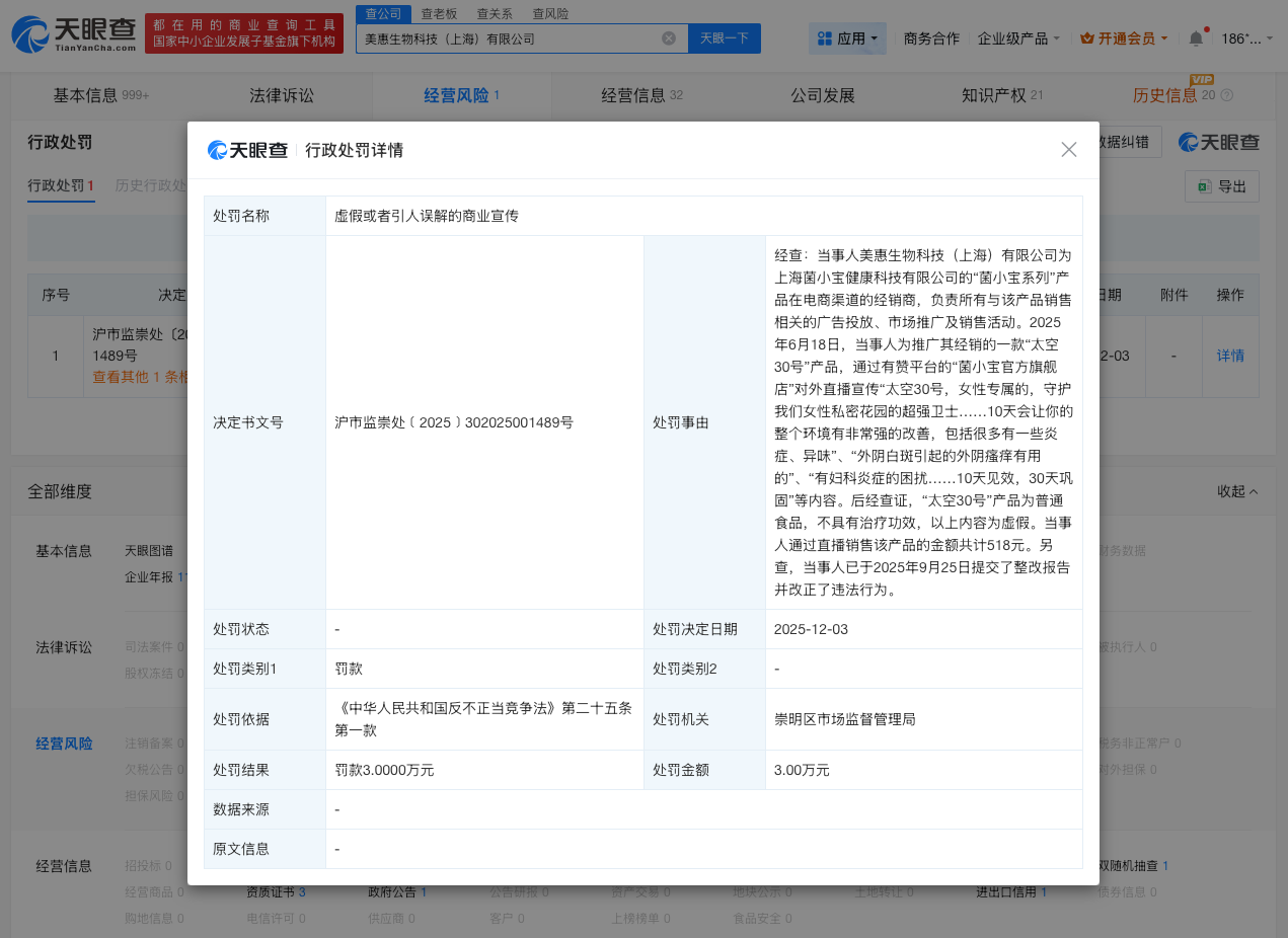 据报道,因宣称可改善妇科炎症等不实内容,日前,益生菌品牌菌小宝电商渠道经销商美惠生物科技(上海)有限公司被上海市崇明区市场监督管理局罚款3万元。