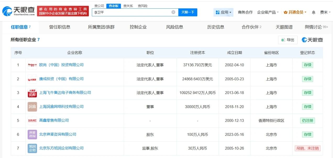 天眼查任职信息显示,李卫平名下关联7家企业,其中6家处于存续或者仍注册状态,包括高鑫零售有限公司、康成投资(中国)有限公司、上海润盒网络科技有限公司等,李卫平在上述企业担任法定代表人、董事等职务,北京东方旭润企划有限公司处于被吊销状态。