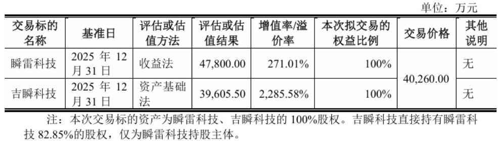 根据交易草案,瞬雷科技100%股权采用收益法进行评估,其价值高达4.78亿元,评估增值率为271.01%。