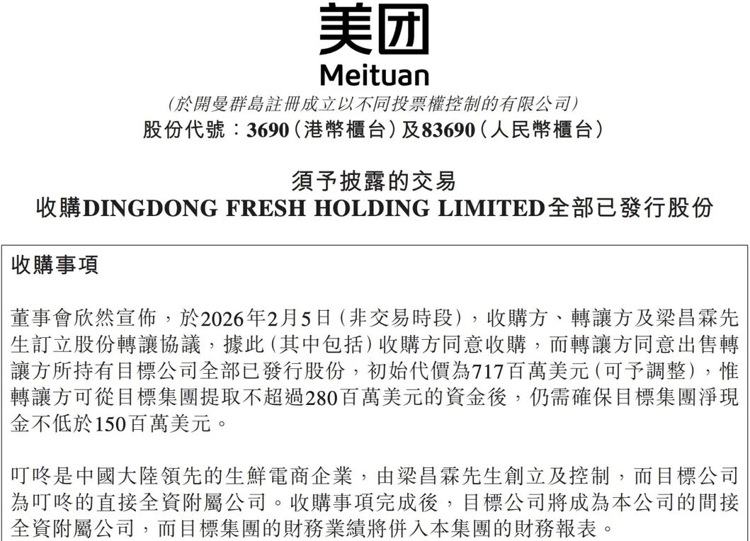2026年2月5日,美团(3690.HK)于港交所披露了一项重要交易,拟以7.17亿美元初始代价(可据实际情况调整)收购叮咚买菜(DDL.N)中国业务100%股权。根据公告,叮咚买菜的海外业务不在本次交易范围内,需在交割前完成剥离;并且,本次交易还需通过国家市场监督管理部门的反垄断审查。