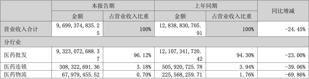 不过,从具体经营来看,嘉事堂各主营板块均面临一定压力。目前,公司收入主要由医药批发、医药连锁、医药物流三大板块构成,其中,医药批发近年来为公司带来九成以上收入。数据披露,2024年以及2025年上半年,医药批发收入同比均出现20%以上幅度下滑,而2025年上半年,医药连锁、医药物流板块收入也分别较上年同期减少39.06%和69.86%。