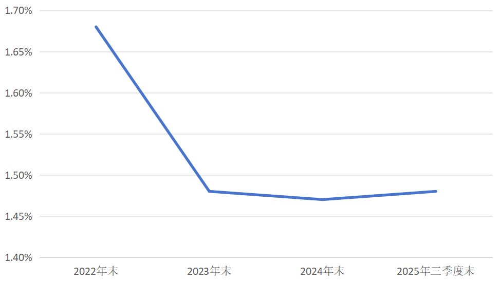 贷款质量方面,2025年三季度末,民生银行不良贷款率为1.48%,也较上年末升0.01个百分点,改变了此前该行不良贷款率连降的趋势。2022年末—2024年末,民生银行不良贷款率分别为1.68%、1.48%、1.47%。
