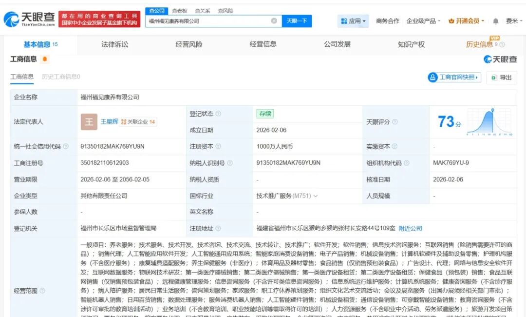 天眼查App显示,近日,福州福见康养有限公司成立,法定代表人为王星辉,注册资本1000万人民币,经营范围包括养老服务、人工智能应用软件开发、人工智能通用应用系统等,由东软集团(600718)、大连东软睿新健康科技有限公司、福州市长乐区城市运营管理有限公司共同持股。