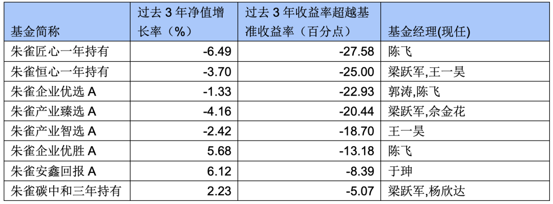 朱雀基金旗下8只产品3年期业绩跑输基准