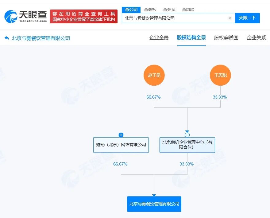 王思聪等在北京成立与雾餐饮管理公司,经营范围包括餐饮管理、外卖递送服务、商业综合体管理服务等