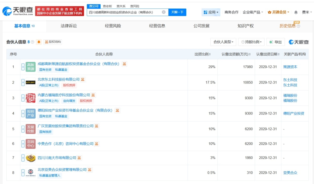 天眼查App显示,近日,四川成德高新科创创业投资合伙企业(有限合伙)成立,执行事务合伙人为北京亚美合众投资管理有限公司,出资额6.2亿人民币,经营范围为创业投资,由成都高新策源启航股权投资基金合伙企业(有限合伙)、东土科技(300353)、福瑞医科(300049)等共同出资。