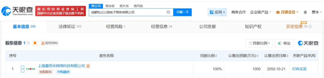 该公司成立于2020年10月,法定代表人为舒适,注册资本1000万人民币,经营范围包括第二类医疗器械销售、信息咨询服务、广告发布等,由叮咚买菜关联公司上海壹佰米网络科技有限公司全资持股。