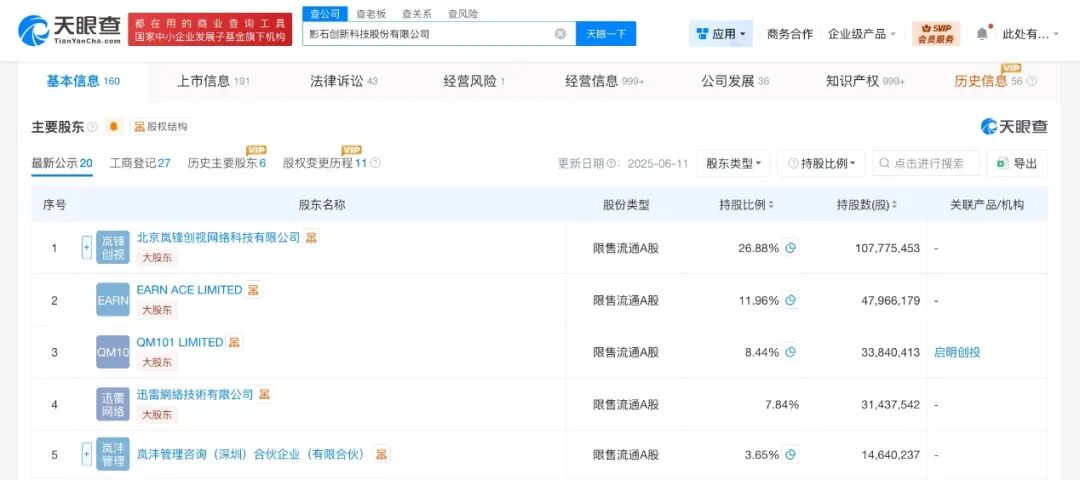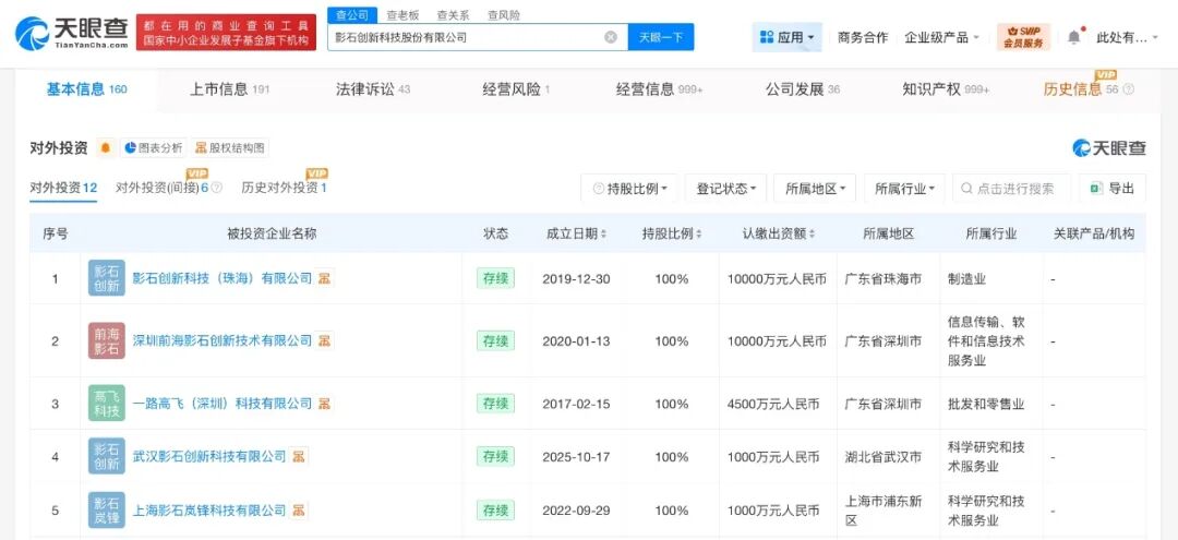 股东信息显示,该公司由北京岚锋创视网络科技有限公司、EARN ACE LIMITED、迅雷網絡技術有限公司等共同持股。对外投资信息显示,该公司直接持股10余家公司,包括影石创新科技(珠海)有限公司、深圳前海影石创新技术有限公司、一路高飞(深圳)科技有限公司等。