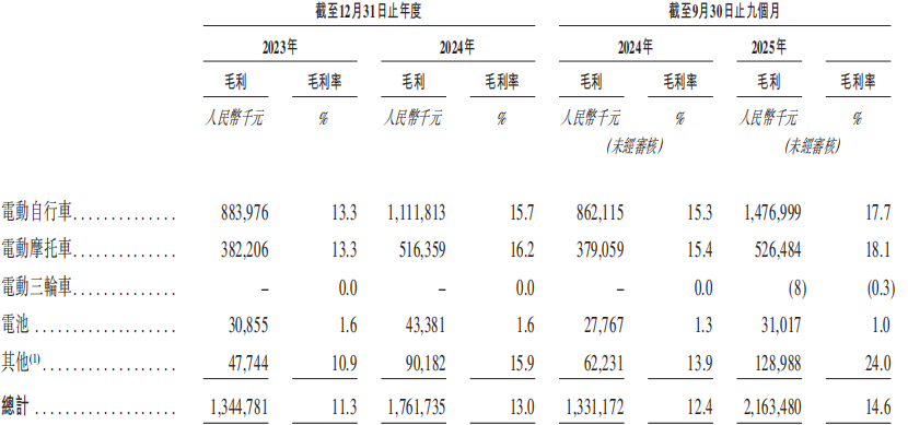报告期内,台铃科技毛利率也有所提升,从2023年的11.3%增至2025年前三季度的14.6%。