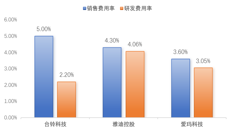 报告期内,台铃科技销售及经销开支分别为5.64亿元、6.87亿元、6.70亿元,分别占各期总收入的4.7%、5.0%、4.5%;各期研发开支分别为2.54亿元、2.95亿元、2.75亿元,研发费用率仅为2%左右。