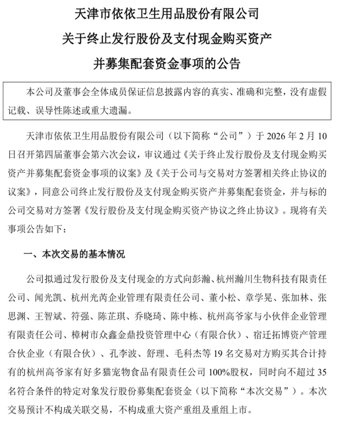 依依股份(001206.SZ)近日发布公告,宣布终止通过发行股份及支付现金的方式,收购19名交易对方合计持有的杭州高爷家有好多猫宠物食品有限责任公司(下称高爷家)100%股权,同时终止向不超过35名特定对象发行股份募集配套资金。2月11日、12日,依依股份股价合计下挫约5%。