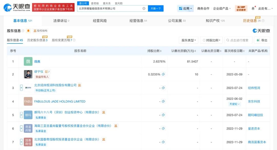 北京辉羲智能信息技术有限公司成立于2022年4月,法定代表人为徐宁仪,经营范围含集成电路设计、人工智能基础软件开发、人工智能应用软件开发、人工智能基础资源与技术平台、集成电路芯片设计及服务、集成电路芯片及产品销售、计算机系统服务、软件开发等。股东信息显示,该公司由魏巍、徐宁仪、经纬恒润(688326)等共同持股。