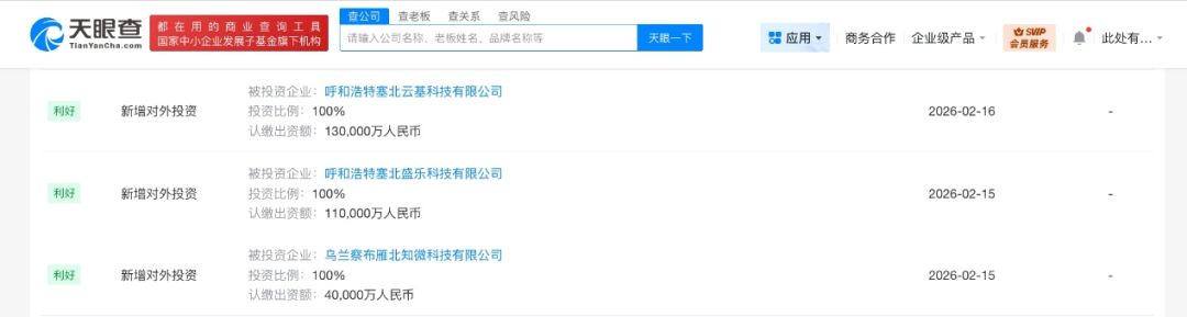 呼和浩特塞北云基科技有限公司、呼和浩特塞北盛乐科技有限公司、乌兰察布雁北知微科技有限公司成立,法定代表人均为董佳建,注册资本分别为13亿人民币、11亿人民币、4亿人民币