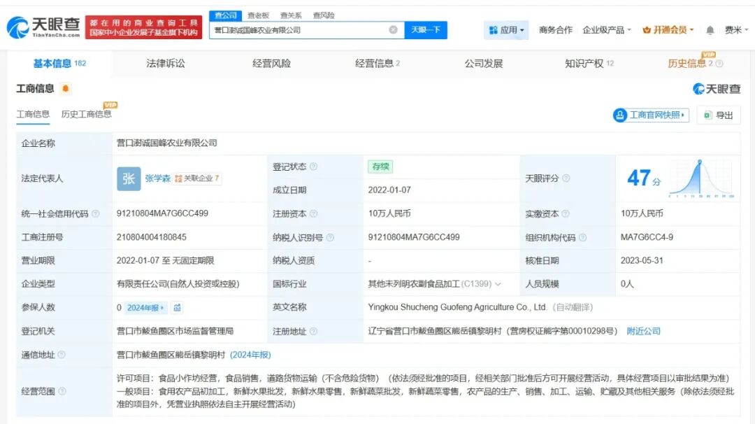 天眼查App显示,营口澍诚国峰农业有限公司成立于2022年1月,法定代表人为张学森,注册资本10万人民币,经营范围包括食品小作坊经营、食品销售、道路货物运输等,由张学森、张学霖共同持股。年报信息显示,该公司连续多年参保人数为0。