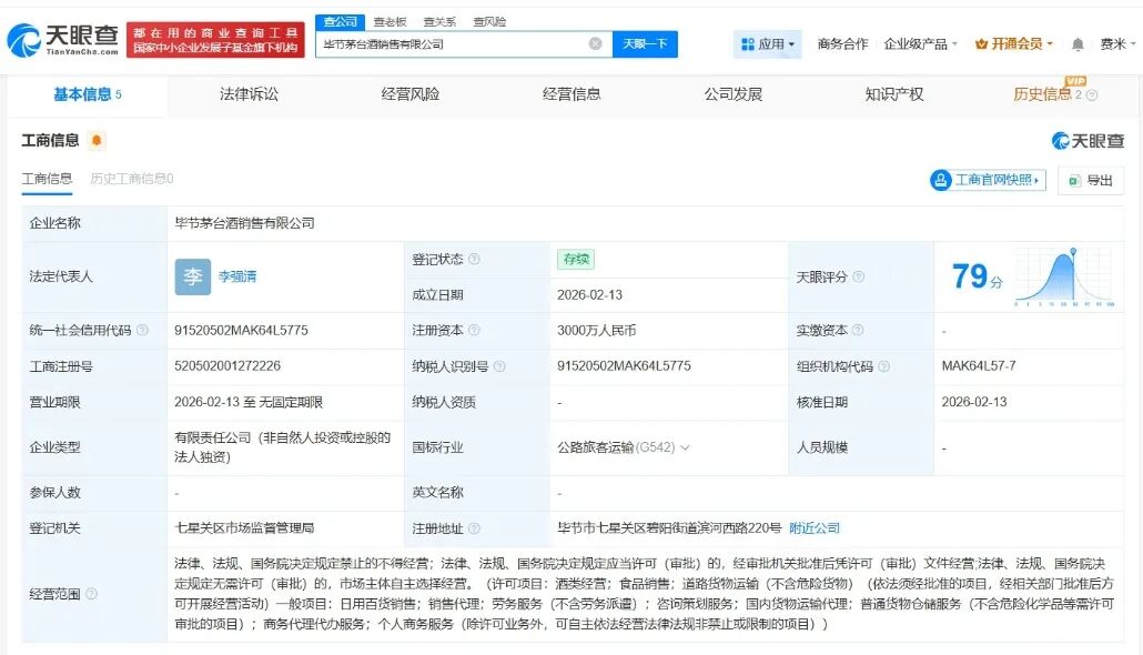 天眼查App显示,近日,毕节茅台酒销售有限公司成立,法定代表人为李强清,注册资本3000万人民币,经营范围包括酒类经营、食品销售、道路货物运输等,由贵州茅台(600519)旗下贵州茅台酒销售有限公司全资持股。