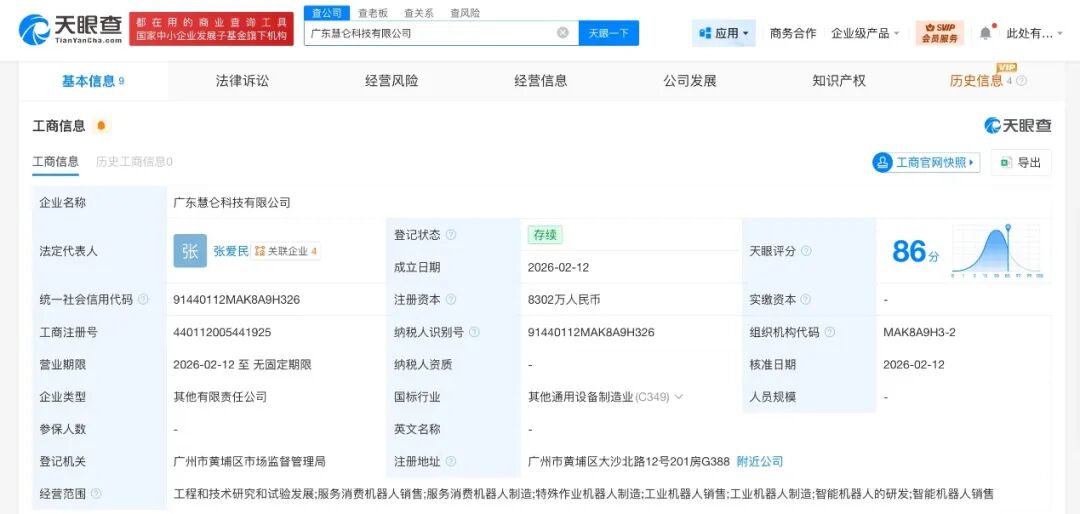 天眼查App显示,近日,广东慧仑科技有限公司成立,法定代表人为张爱民,注册资本8302万人民币,经营范围为工程和技术研究和试验发展、服务消费机器人销售、服务消费机器人制造、特殊作业机器人制造、工业机器人销售、工业机器人制造、智能机器人的研发、智能机器人销售等。股东信息显示,该公司由广汽集团(601238)、广州仑驰投资合伙企业(有限合伙)、广州仑步投资合伙企业(有限合伙)、张爱民共同持股。